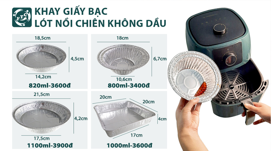 Ở FTC có nhiều mẫu mã, kích thước đa dạng. Khay giấy bạc của chúng tớ không chỉ dùng cho nồi chiên không dầu mà còn dùng cho nhiều món ăn, nhiều mục đích khác nhau.